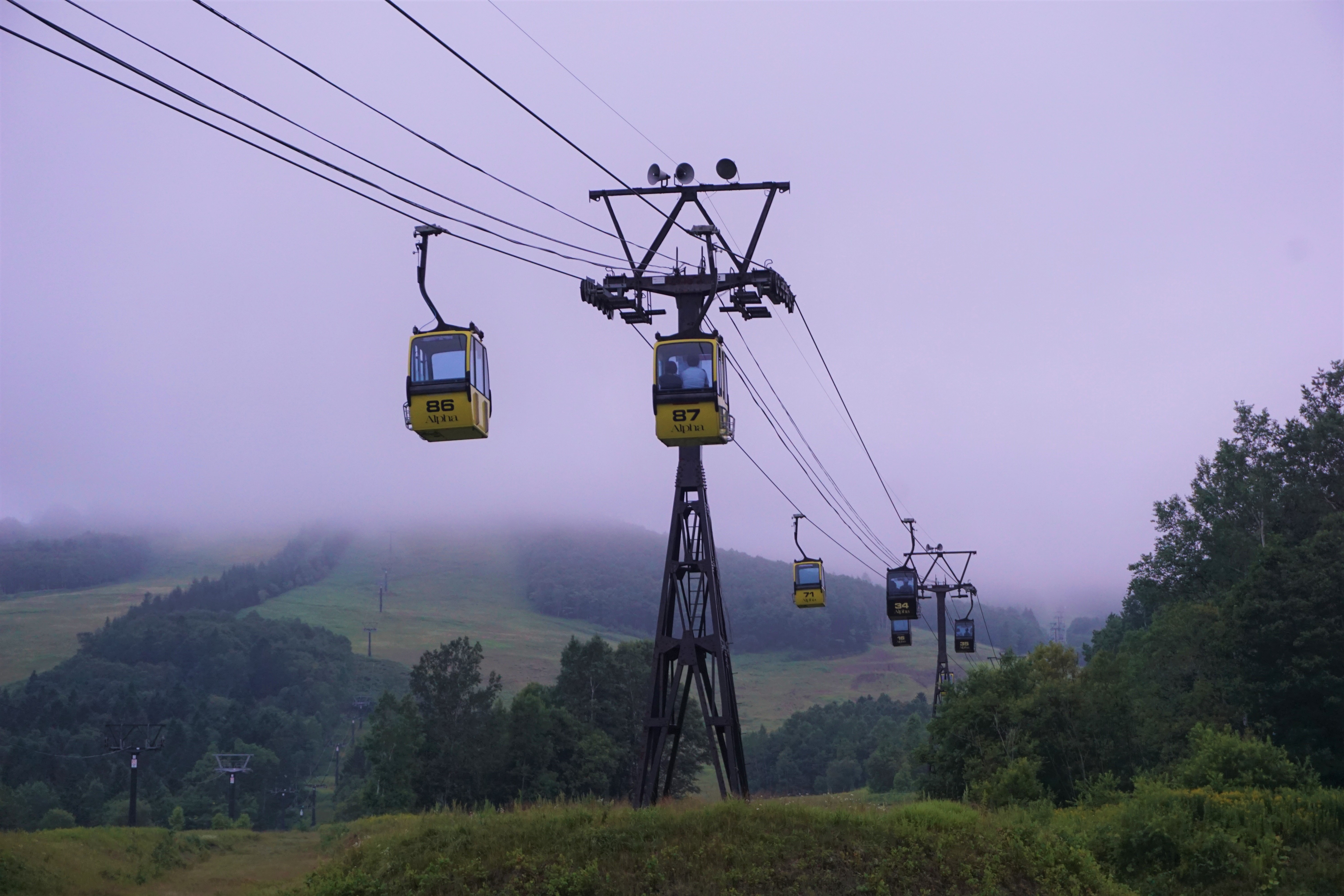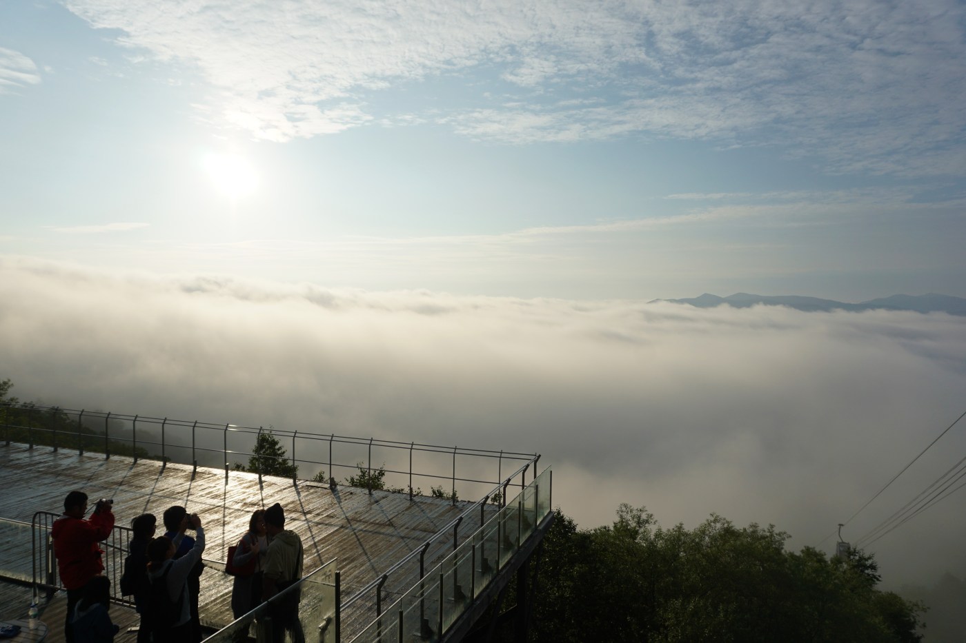 Pour se rendre à la Unkai Terrace, il faut prendre un téléphérique (13minutes de montée). Ce dernier ouvrait officiellement à 5h. Ils ont ouvert bien avant, au final, vu le monde. A bord du téléphérique, au fil de la montée, on passe d’un monde à un autre avec comme frontière entre les deux, les nuages.