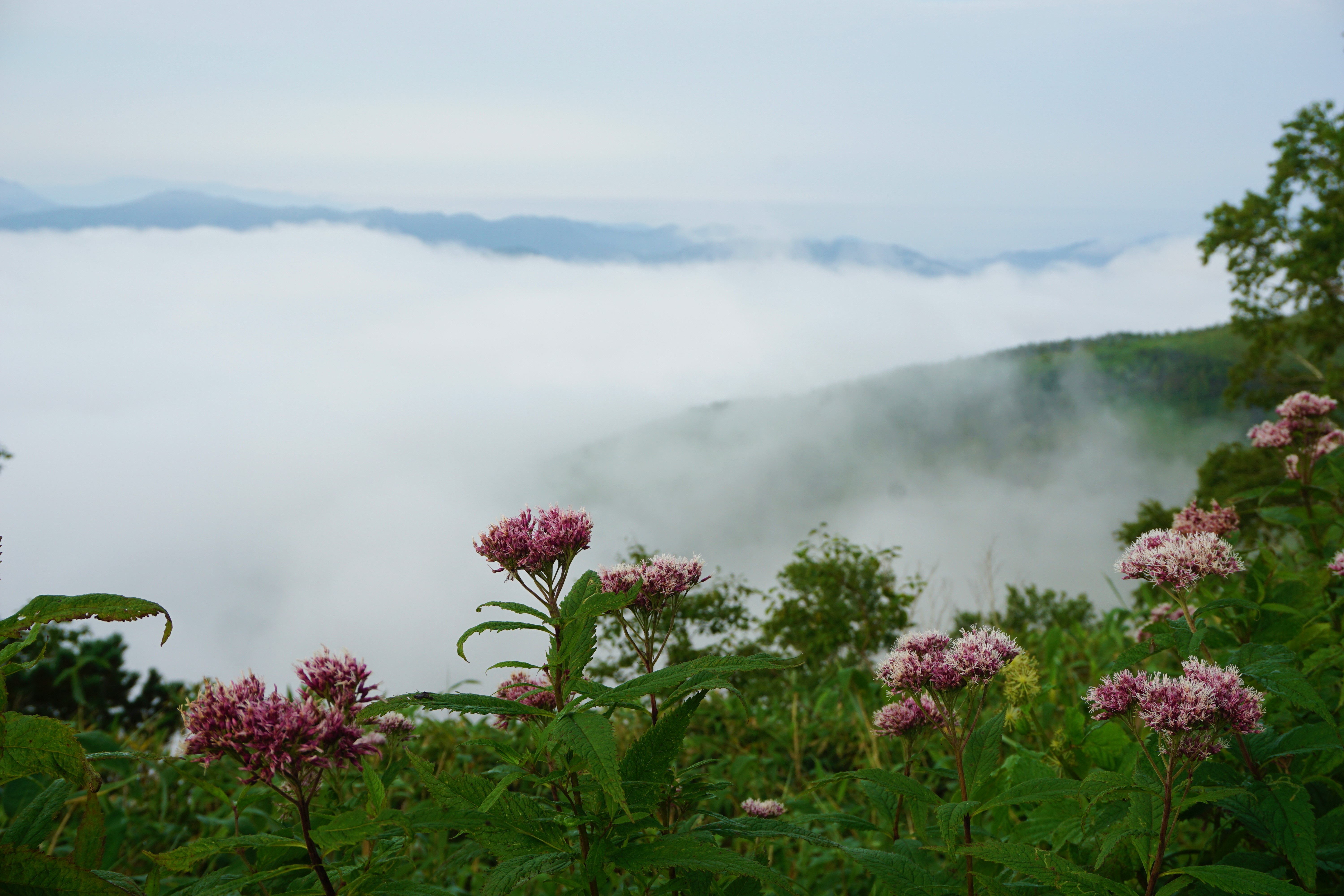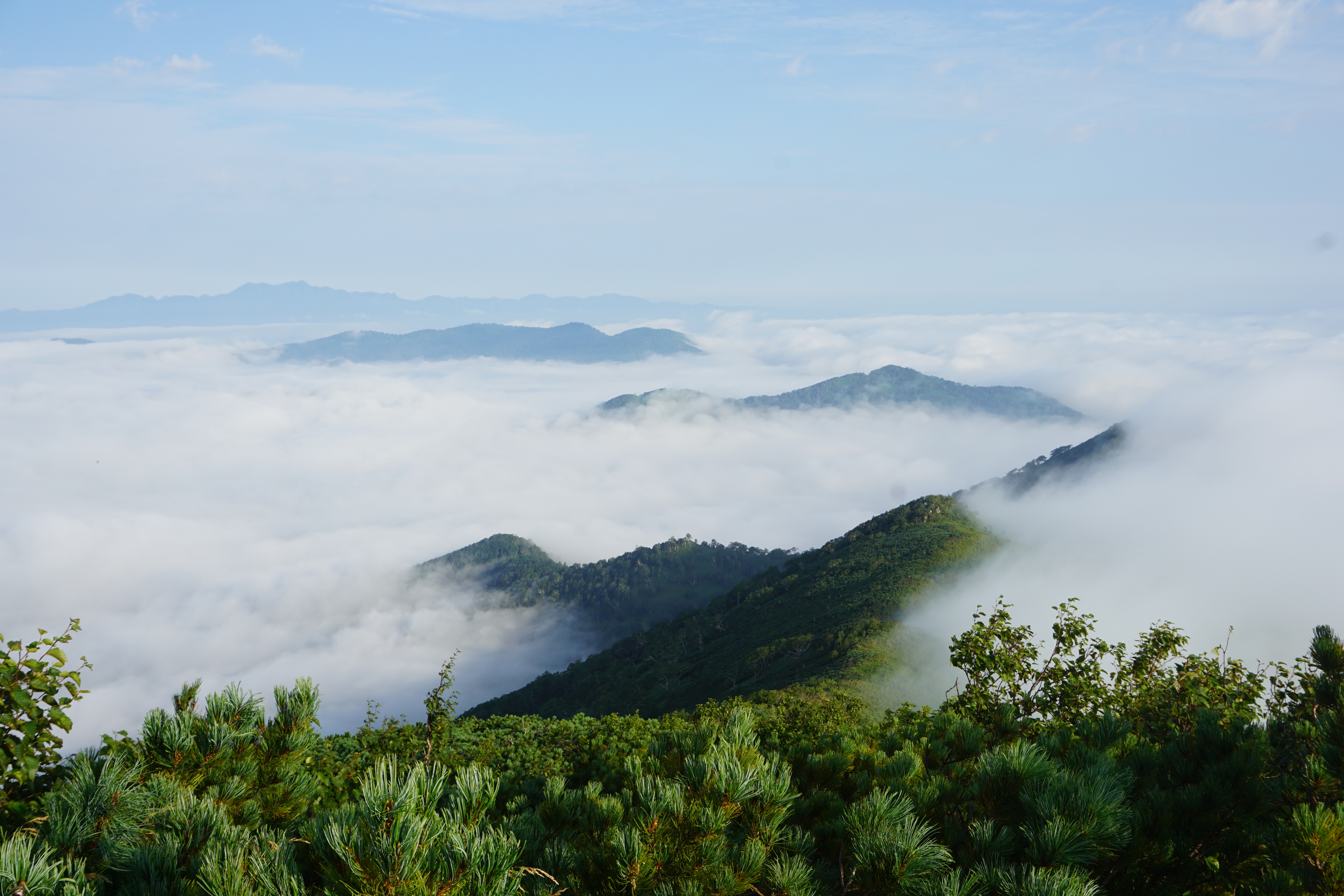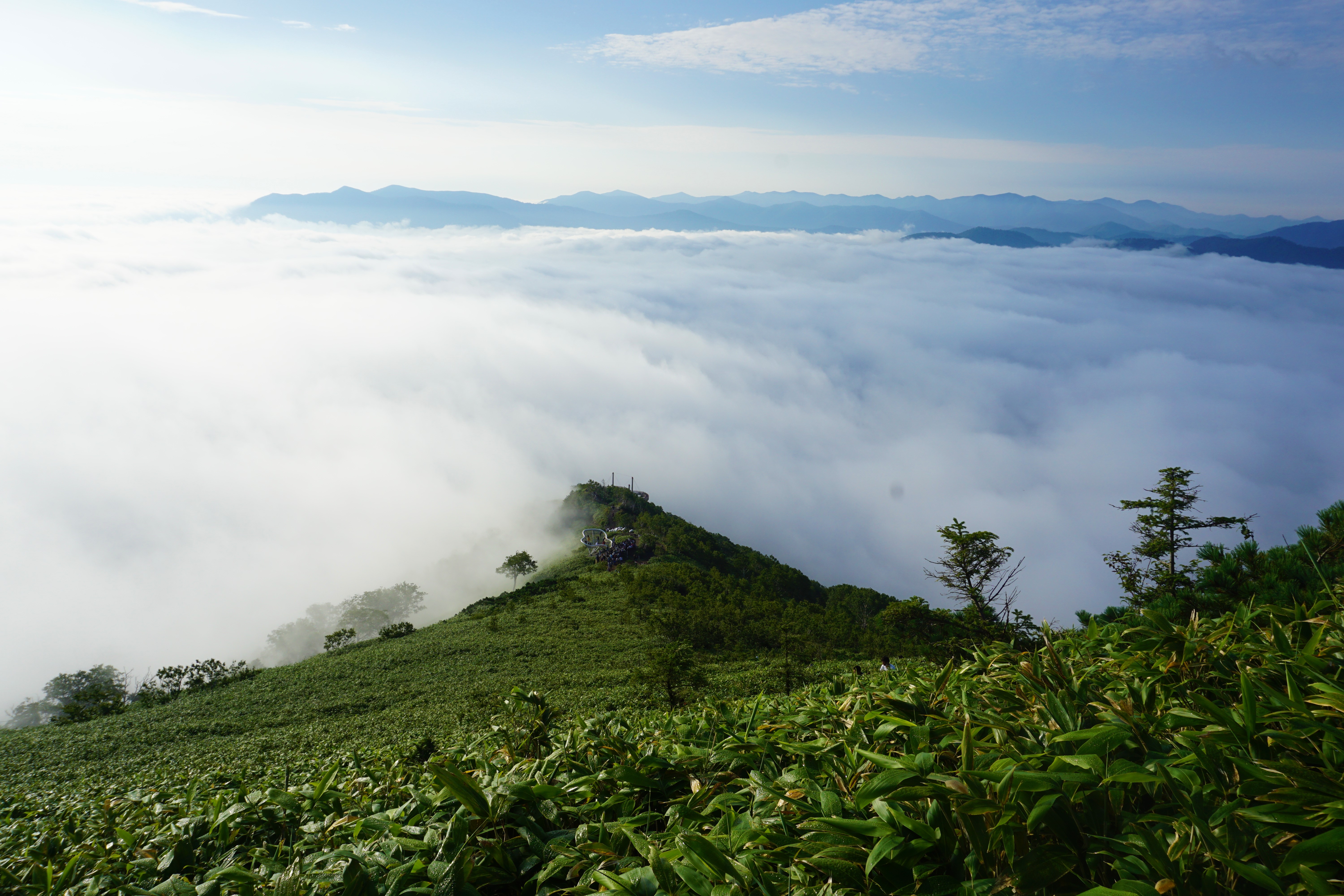 « Unkai » veut dire « mer de nuages ». C’est exactement cela. Une mer de nuages à perte de vue. J’ai même pu voir un début de « cascade », ce que je désirais par dessus tout. Ce phénomène d’Unkai est dû à la basse température de l’eau de la mer, aux vents chauds venant du sud et à la pression atmosphérique de l’Océan Pacifique combinés. Cela donne un résultat incroyable. Il faisait beau (je ne sais pas pourquoi ça m’a surprise, il fait forcément beau au dessus des nuages non?!), il faisait chaud et le paysage était merveilleux.