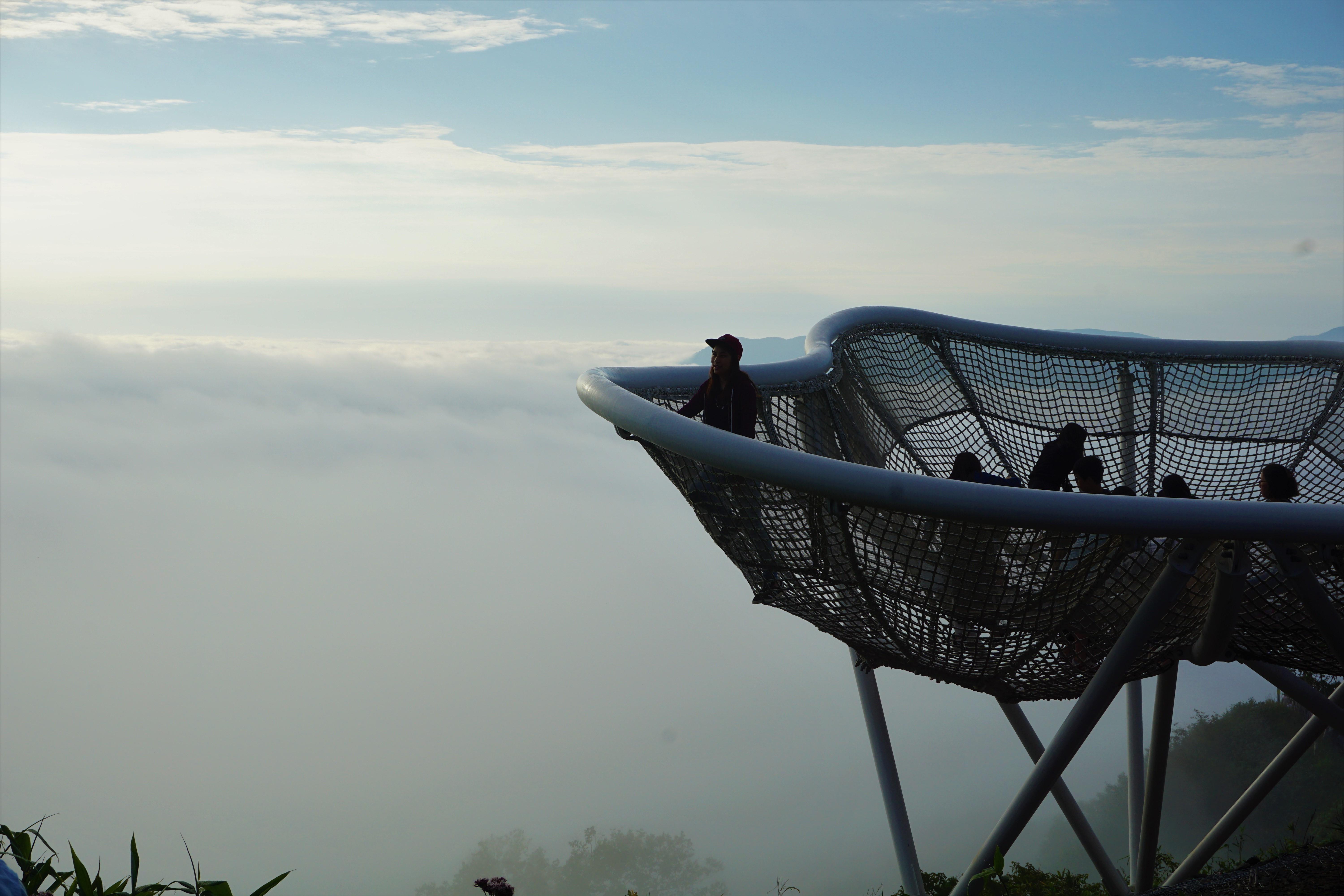 Le long du chemin, on trouve plusieurs installations. La première est le « bar à nuage ». ce sont des chaises (très) hautes d’où l’on peut admirer la vue. Vient ensuite une passerelle, que j’ai beaucoup aimé car on est dans le vide face au nuages sans « obstacle » entre nous et cette mer nuageuse. Un peu plus haut, on peut s’arrêter aux « lits-nuages », des boules un peu molles sur lesquelles on peut se reposer. On peut par la suite s’asseoir sur des bancs et apprécier le spectacle. L’attraction que la plupart des petits et des grands souhaitent faire c’est l’espèce de filet géant au dessus des nuages, limité à 10 personnes en même temps.