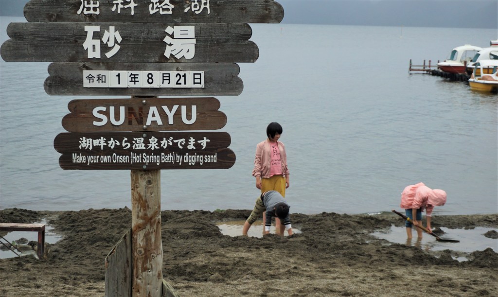 Sur la plage, au bord de l’eau, les visiteurs sont invités à creuser leur propre onsen dans le sable. La température de l’eau avoisine les 60°. En la mélangeant avec l’eau du lac, on peut se faire un bain de pied très agréable.