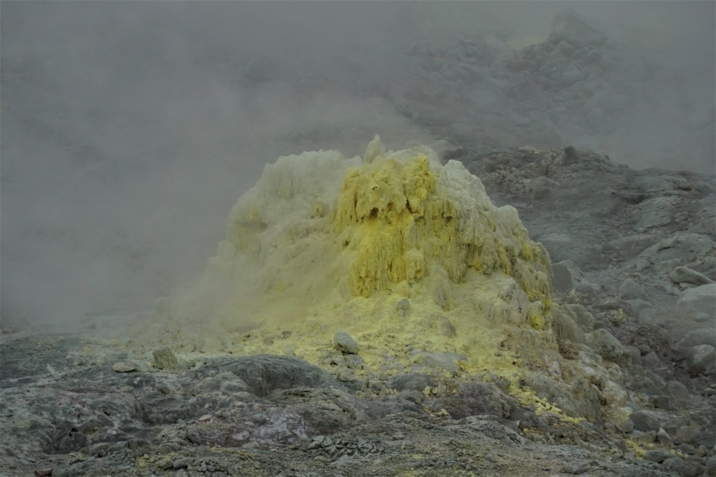 Je parlais du GPS un peu plus haut et cette fois j’ai choisi de ne pas écouter ce qu’il me disait, sans raison particulière. Une fois encore j’ai bien fait ! Si j’avais pris le chemin que le GPS m’indiquait, j’aurais loupé ce qui va suivre. Dans la voiture, au loin, je pouvais apercevoir du jaune et de la fumée s’échapper d’une montagne. En me rapprochant, une odeur d’œuf pourri se faisait sentir. Je me suis donc arrêtée et j’ai été me balader au près du volcan encore actif du mont Io. Ce volcan est connu pour l’exploitation de ses 1500 cratères afin d’y extraire du soufre.